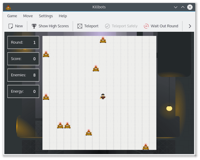 killbots is a simple game of evading killer robots. The robots are numerous and their sole objective is to destroy you. Fortunately for you, their creator has focused on quantity rather than quality and as a result the robots are severely lacking in intelligence. Your superior wit and a fancy teleportation device are your only weapons against the never-ending stream of mindless automatons.