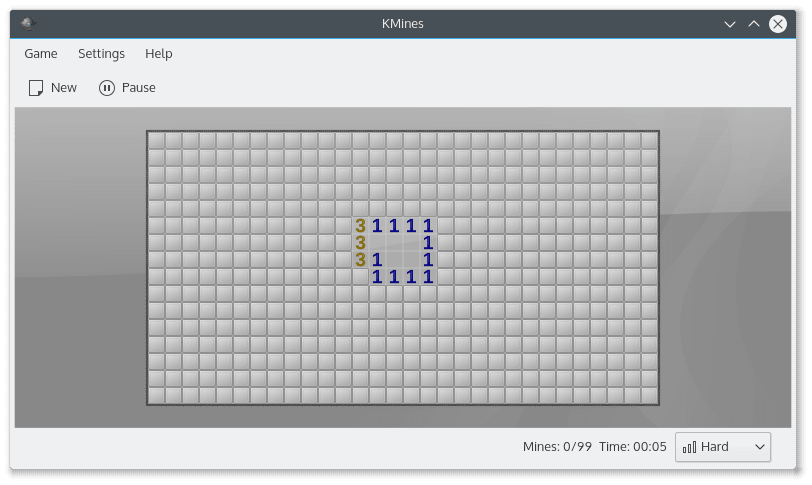 KMines is a classic Minesweeper game. The idea is to uncover all the squares without blowing up any mines. When a mine is blown up, the game is over.