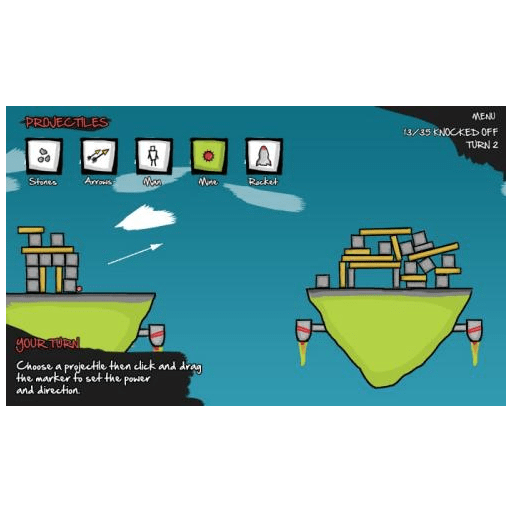 In Knockdown you build and destroy towers with a variety of materials and weapons. Create steel fortresses that can withstand enemy mines and throw stones, grenades and even tiny men to bring the opposing side to their knees!