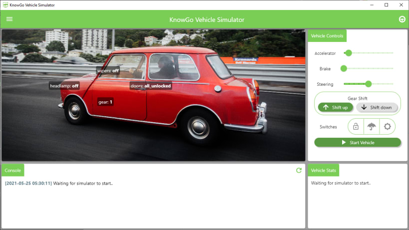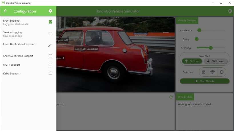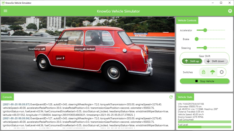 KnowGo Vehicle Simulator is an interactive multi-platform Connected Car simulator capable of generating and streaming realistic vehicle telemetry to REST API endpoints, KnowGo Car backends, and various data brokers (MQTT, Kafka) to aid in the development of Connected Car services.