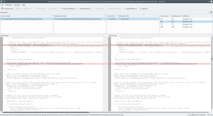 Kompare is a GUI front-end program that enables differences between source files to be viewed and merged. It can be used to compare differences on files or the contents of folders, and it supports a variety of diff formats and provide many options to customize the information level displayed.