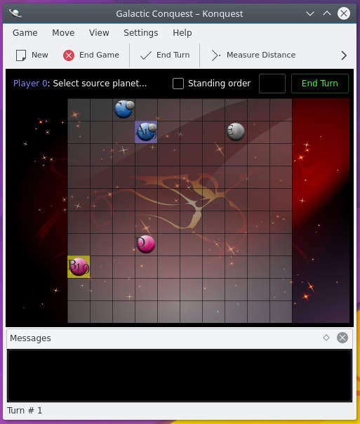 Konquest is a version of Gnu-Lactic Konquest. Players conquer other planets by sending ships to them. The goal is to build an interstellar empire and ultimately conquer all other player's planets.