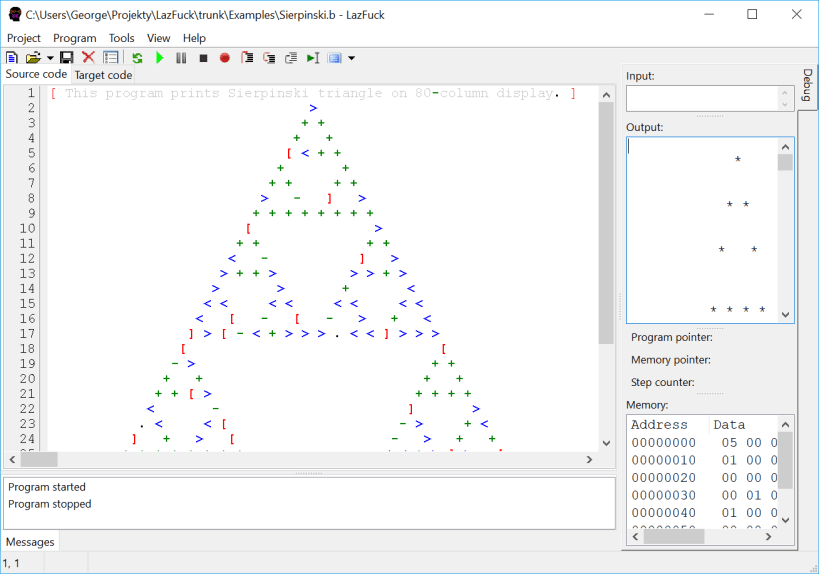 LazFuck is GUI application for writing, executing, compiling and debugging programs written in famous BrainFuck esoteric programming language.
