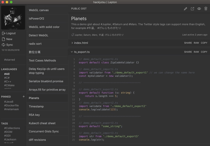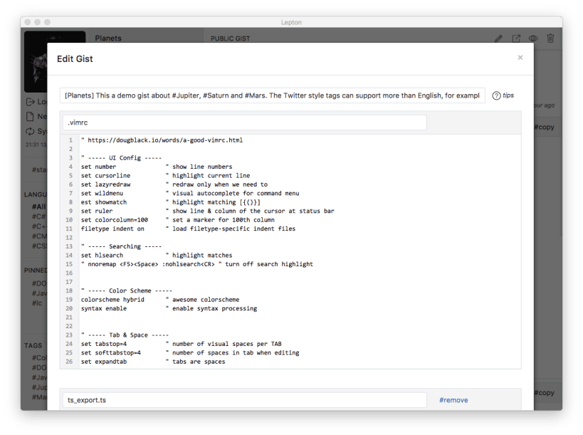Lepton is a code snippet manager based on GitHub Gist.