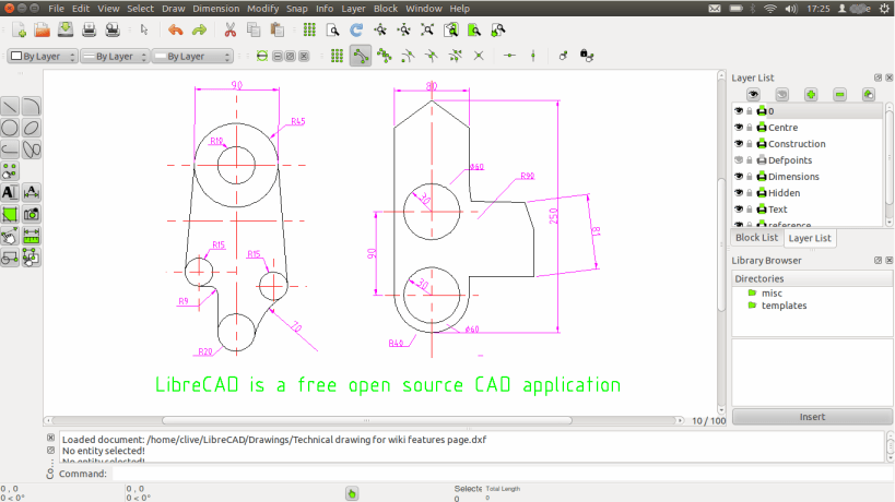LibreCAD is a cross-platform 2D CAD program written in C++17. It can read DXF/DWG files and can write DXF/PDF/SVG files. It supports point/line/circle/ellipse/parabola/spline primitives. The user interface is highly customizable, and has dozens of translations. Code repository: https://www.github.com/LibreCAD/LibreCAD