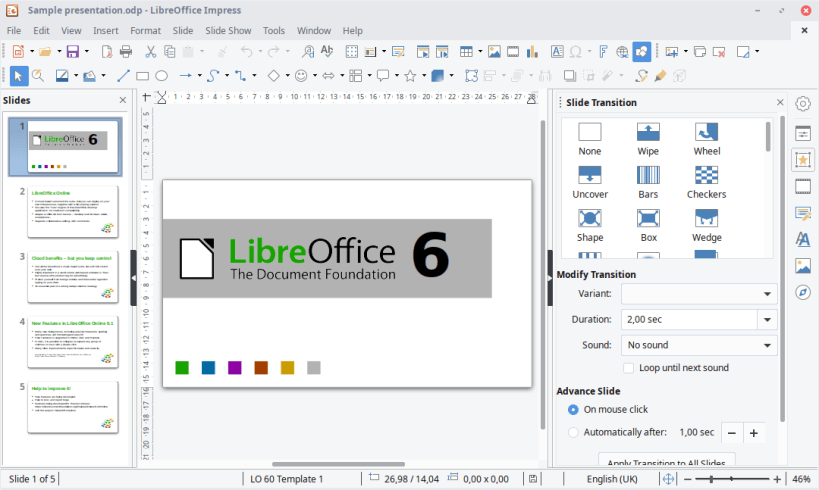 LibreOffice is a free and open source office suite, developed by The Document Foundation. The LibreOffice suite comprises programs for word processing, the creation and editing of spreadsheets, slideshows, diagrams and drawings, working with databases, and composing mathematical formulae.