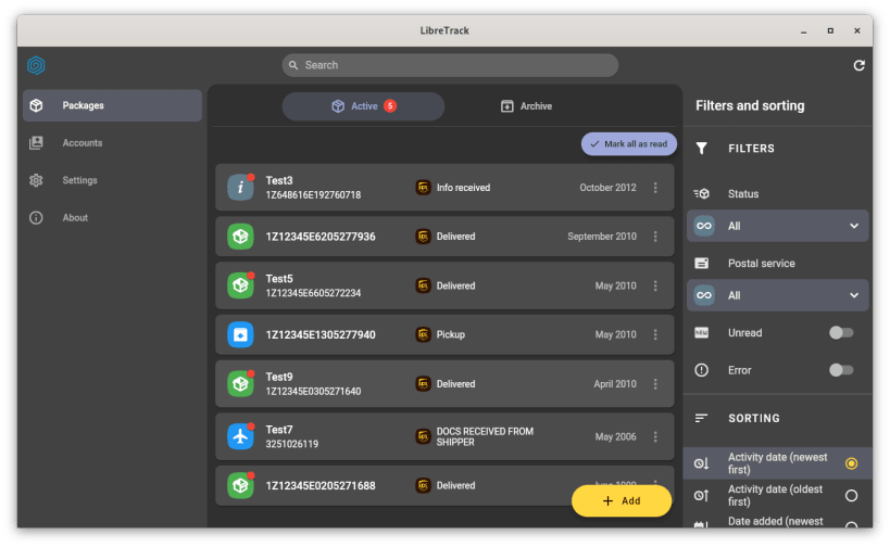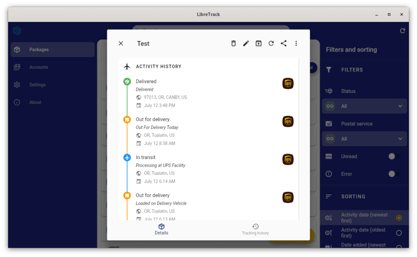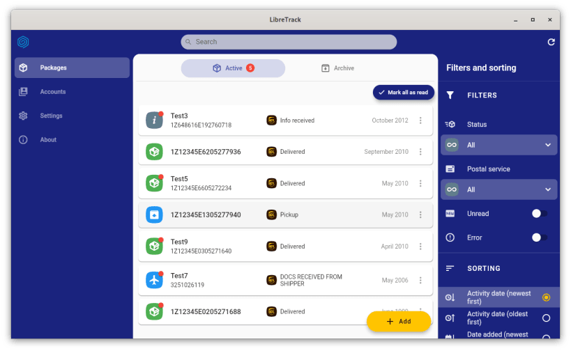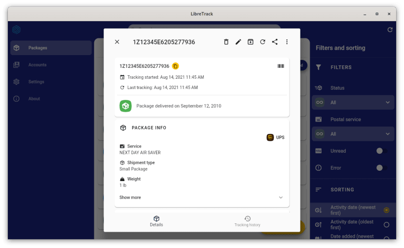 Track postal items directly on your device using accounts of postal services. The app respects your privacy and freedom: you don't use third-party online services.