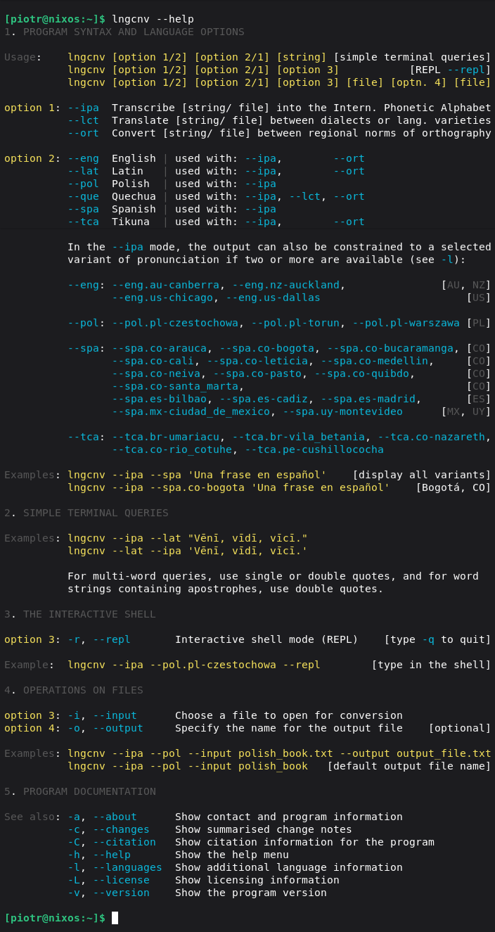 lngcnv is capable of presenting the precise pronunciation of a phrase using the International Phonetic Alphabet (IPA). It can also translate between various dialects of a language and convert between different orthographic norms.