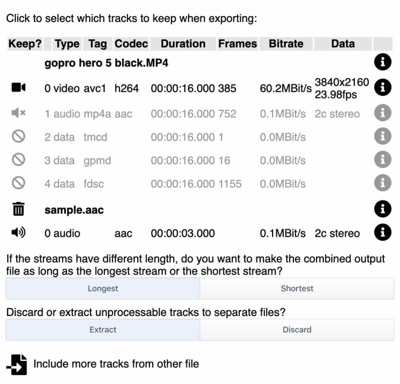 LosslessCut aims to be the ultimate cross platform ffmpeg GUI for extremely fast and lossless operations on video, audio, subtitle and other related media files. The main feature is lossless trimming and cutting of video and audio files, which is great for saving space by rough-cutting your large video files taken from a video camera, GoPro, drone, etc. It lets you quickly extract the good parts from your videos and discard many gigabytes of data without doing a slow re-encode and thereby losing quality. Or you can add a music or subtitle track to your video without needing to encode. Everything is extremely fast because it does an almost direct data copy, fueled by the awesome ffmpeg which does all the grunt work.