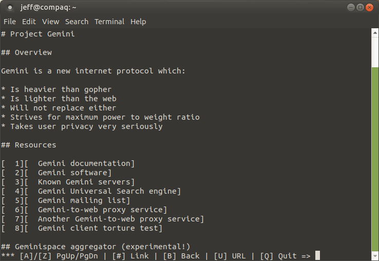 LR-87 is a simple implementation of a client for launching into the world of the Gemini protocol, a fun place somewhere between Gopher and the World Wide Web. The client is implemented entirely in Fortran. This client is somewhat limited, but users can do most simple browsing with it from the terminal. This distribution assumes you're using a dumb terminal.
