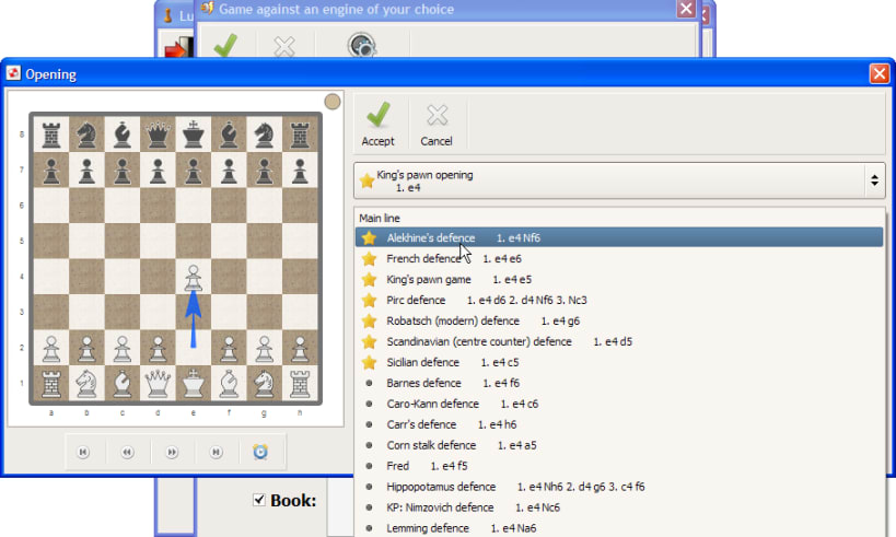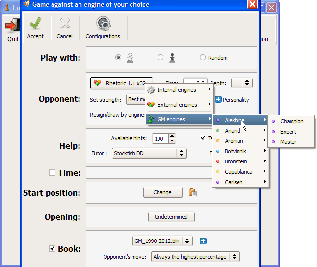 This list of engines is not closed and you can add other ones with the only limitation that they use the UCI protocol. The game can be set, limiting the depth of analysis of the motor or the time used to think, or by modifying the way in which it decides. You can also choose the opening, or start in a certain position, or that the engine uses a book of openings or more or less aid. Younger children will be able to begin their apprenticeship with special engines that know little more than moving the pieces, and this will enable them to win against the engines from the very beginning.