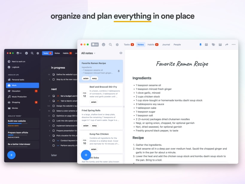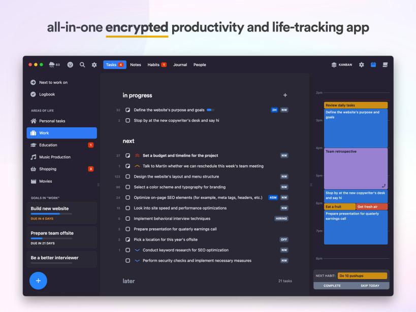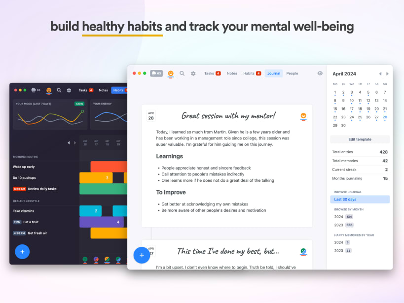 Our all-in-one approach allows us to integrate all the pieces together. Tasks with calendar, calendar with habits, or events with notes.