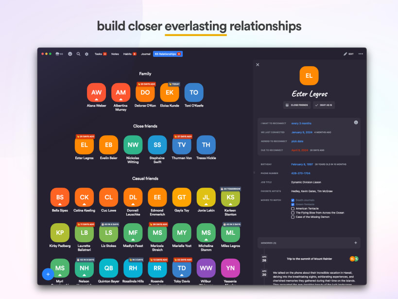 Keep track of everything related to your friends and family, what to talk about next time you meet, and say goodbye to missed anniversaries, forever. You are not as alone as you might think.