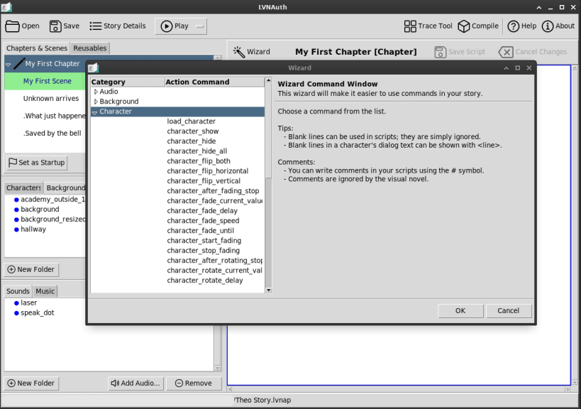 A command system: You can start or stop actions in your visual novel by using simple commands.