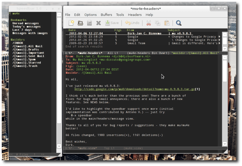 mu is a tool for dealing with e-mail messages stored in the Maildir-format, on Unix-like systems. mu’s main purpose is to help you to find the messages you need, quickly; in addition, it allows you to view messages, extract attachments, create new maildirs and more.