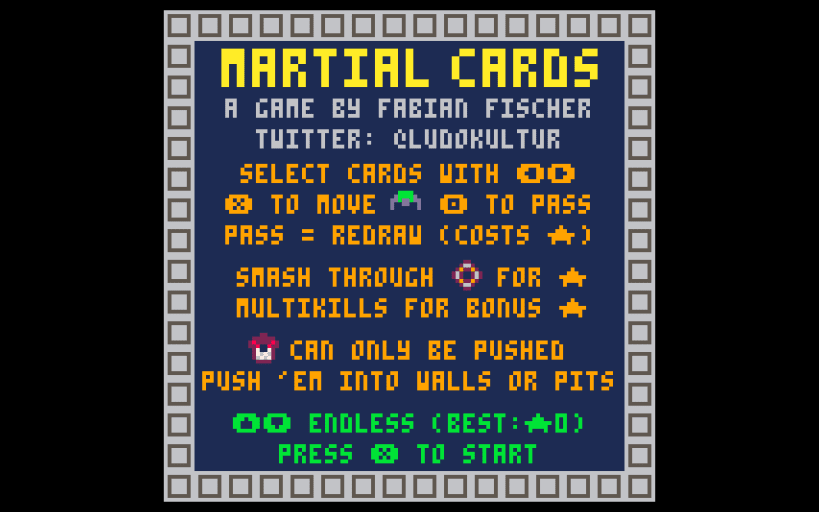 You signed up for the biggest martial-arts challenge in history! In a gauntlet beyond example, contestants from all around the world face myriads of artificial monstrosities to find out who can deal with them performing the most stylish and efficient combos. There’s a twist though - you can only move in accordance with the hand of cards you’re holding. Ah, there’s nothing like the beautiful arbitrariness of game rules...