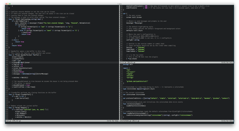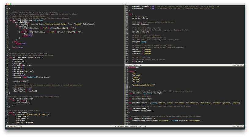 Micro has standard keybindings (Ctrl-s to save, Ctrl-z to undo, Ctrl-q to quit, etc...) and supports a wide variety of features, including:
