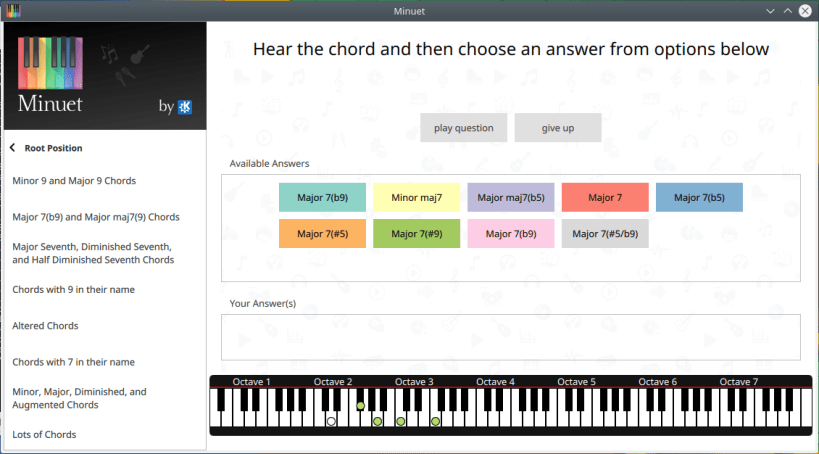 Minuet is an application for music education. It features a set of ear training exercises regarding intervals, chords, scales and more.