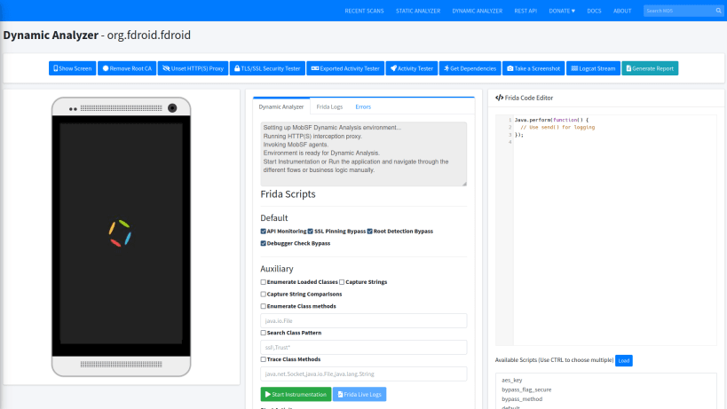 Mobile Security Framework (MobSF) is an automated, all-in-one mobile application (Android/iOS/Windows) pen-testing, malware analysis and security assessment framework capable of performing static and dynamic analysis. MobSF supports mobile app binaries (APK, XAPK, IPA & APPX) along with zipped source code and provides REST APIs for seamless integration with your CI/CD or DevSecOps pipeline.The Dynamic Analyzer helps you to perform runtime security assessment and interactive instrumented testing.