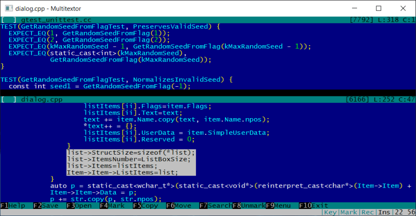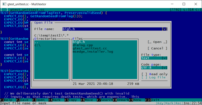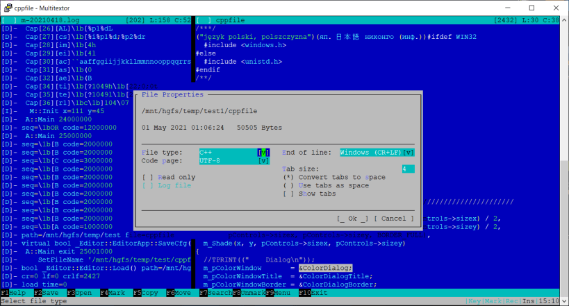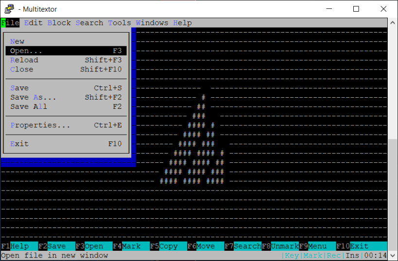 Multitextor is simple cross platform console mode text editor. It has very simple interface same in different environments (with menu and dialog). Editor supports mouse and keyboard cursor movement. It has multi-window editing, split view mode with 2 panels. Can clear works with different text code pages. Has different selecting modes. Can work with files over 4 GBytes (with small memory using). Has deep Undo/Redo buffer.