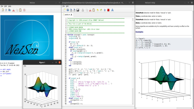 Nelson is an matrix/array programming language providing a powerful open computing environment for engineering and scientific applications using modern C/C++ libraries (Boost, Eigen, …) and others state of art numerical libraries. It has sophisticated data structures (including cell, struct, linear systems, …), an interpreter and a high level programming language. Nelson has been developed to be an open/modular system where an user can define these own data types and operations on these data types by using overload. Syntax is very similar to GNU Octave or MATLAB® so that most programs are easily portable.