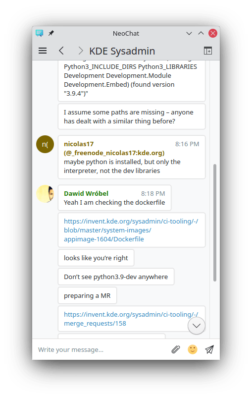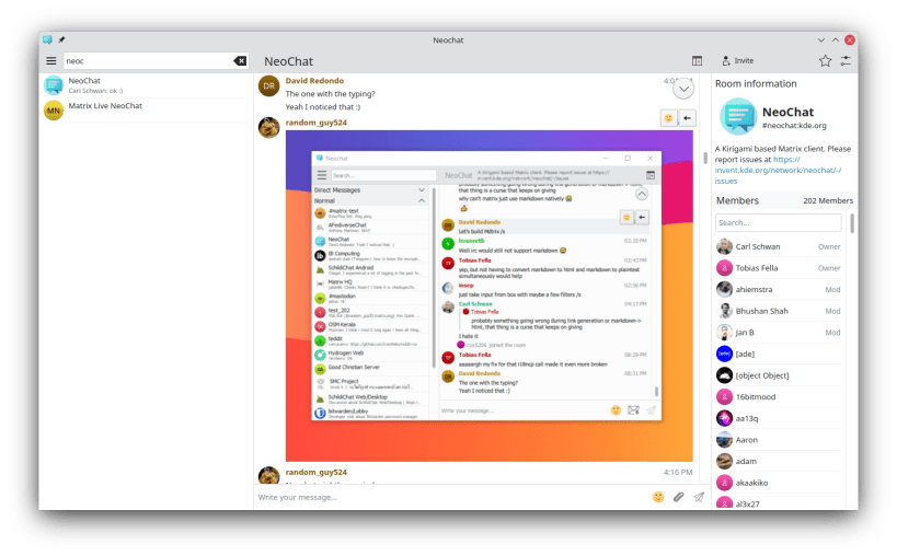 NeoChat is a chat app that lets you take full advantage of the Matrix network. It provides you with a secure way to send text messages, videos and audio files to your family, colleagues and friends.