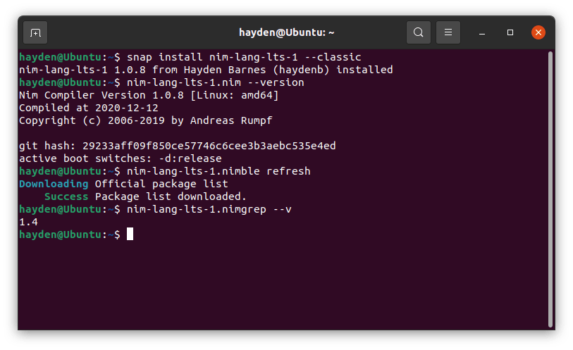 $ snap install nim-lang-lts-1 --classic