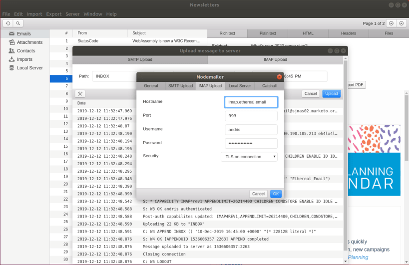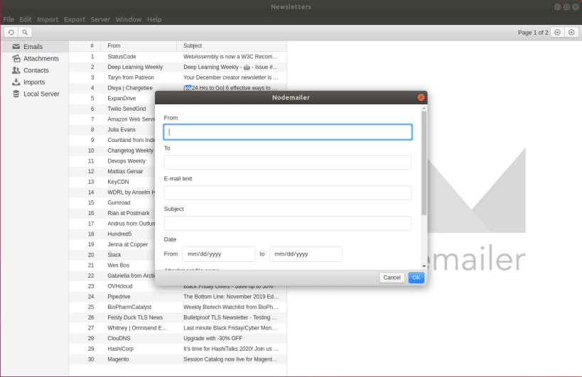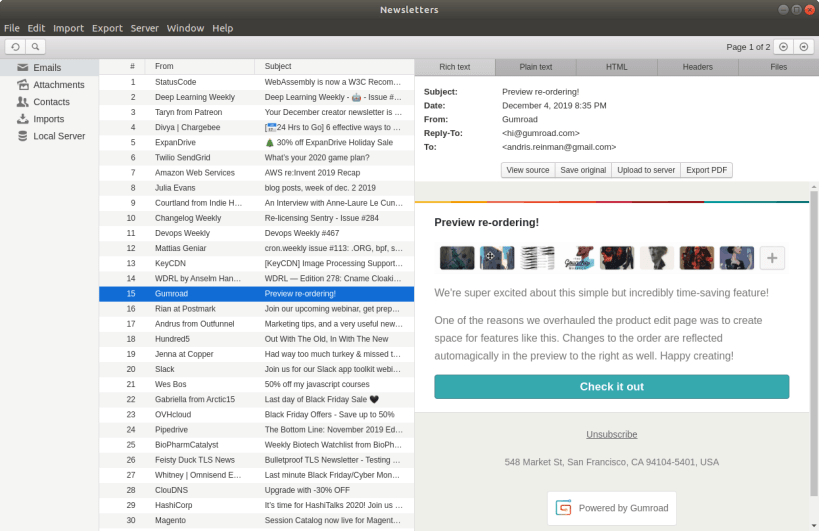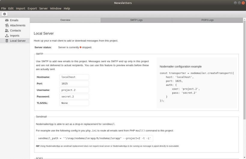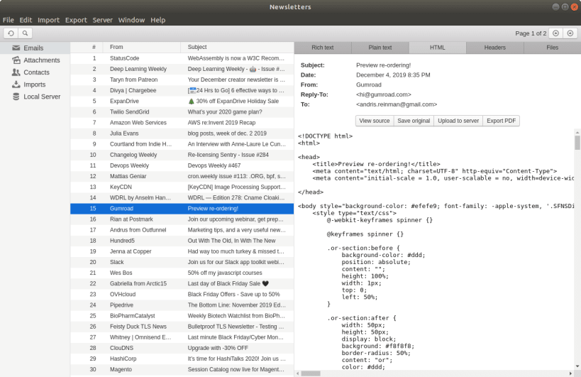 App includes local SMTP and POP3 servers, a sendmail replacement, and it imports emails from EML files, EMLX files, large MBOX files from Gmail takeout, Maildir folders and Postfix queue files for inspection and preview. Ever wanted to view the actual HTML source of a nicely designed email instead of some garbled rfc822 text? Just open the HTML tab of an email to see it.