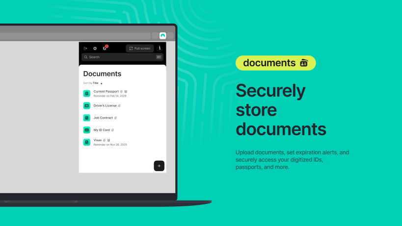 ➡️ Documents Securely store and organize PDFs and scans of passports, IDs, and any important paperwork. Add expiry dates and get automatic reminders before anything runs out.