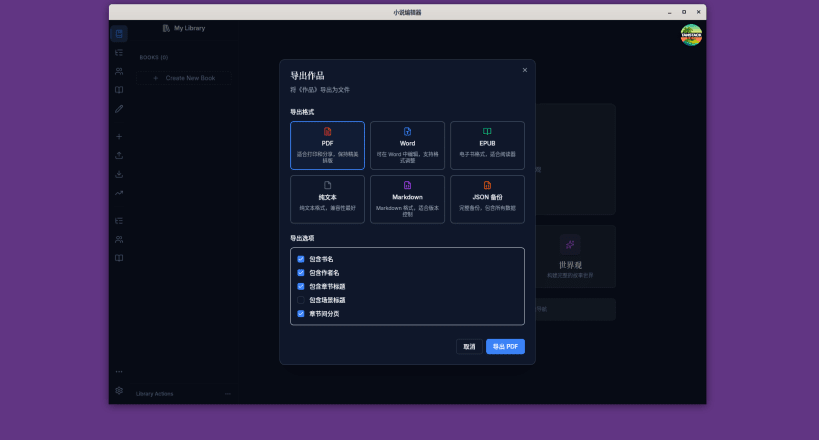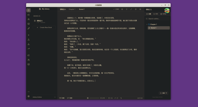 A comprehensive novel writing application with character management, world-building tools, and advanced text editing capabilities for serious authors.