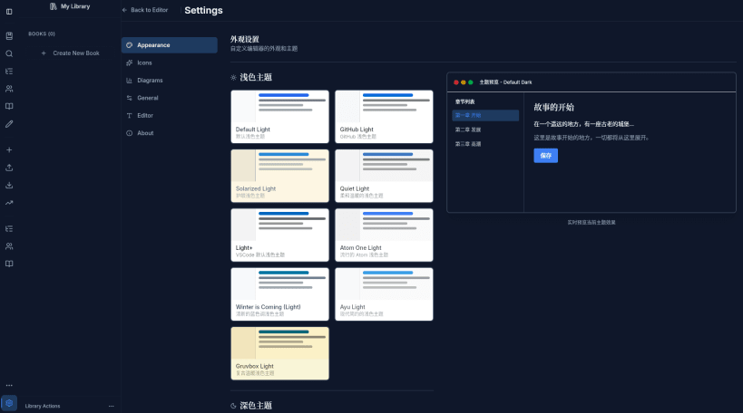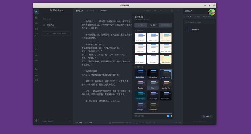 • Writing statistics panel with word count, reading time, and chapter distribution analytics