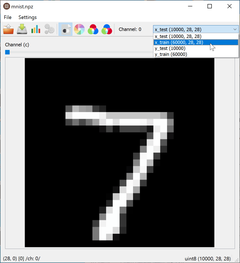 It features full support for 4d arrays, such as Tensors. During debugging, a Tensor can be saved using np.save() and analyzed by this tool. The tool allows to slice through batches and channels, and can merge channels into RGB/BGR into one rendered view.