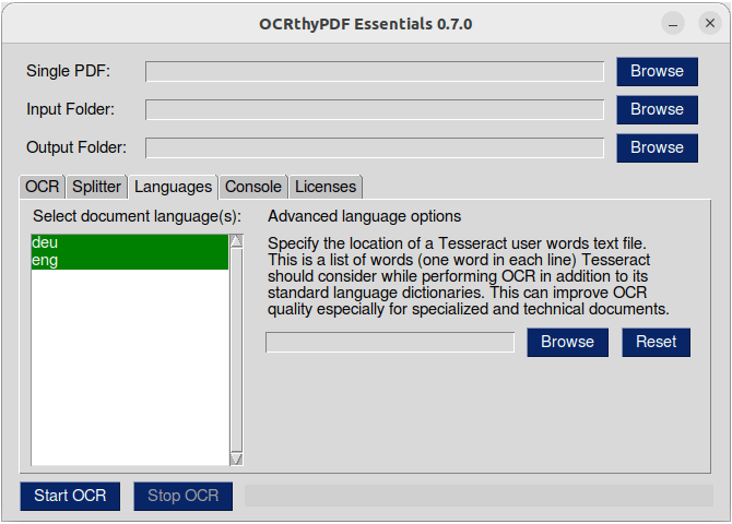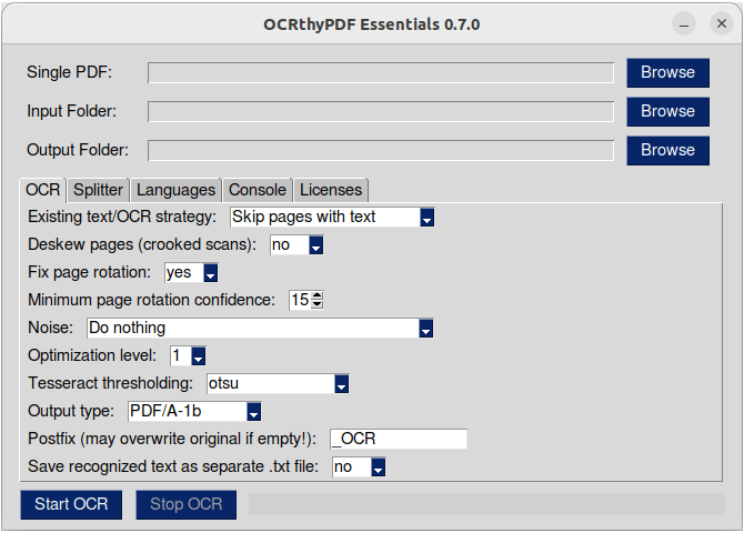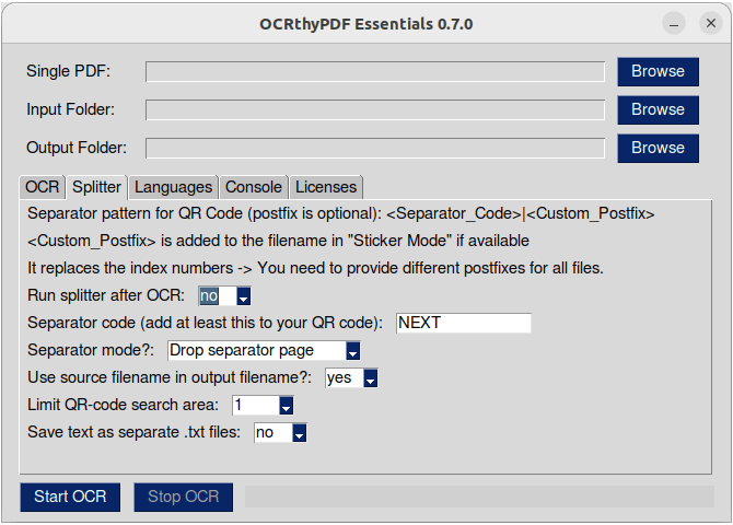 The splitter function extends the text recognition provided by OCRmyPDF. It adds the feature to separate scanned documents at separator pages - defined by a QR code - before text recognition. A QR code can mark a separator-only page that will be discarded. Alternatively, in Sticker Mode, the QR code can mark the first page of a new document and is retained.