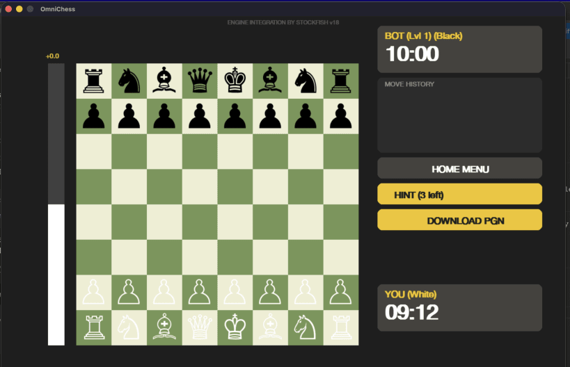 OmniChess is an open-source chess application built entirely in Python. Features Stockfish engine integration, 8 difficulty levels, custom ELO mode, local multiplayer, Lichess puzzles, post-game analysis, seasonal board themes, eval bar, hints, takebacks, board coordinates, and PGN export. Fully offline once installed (puzzles require internet).