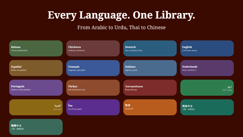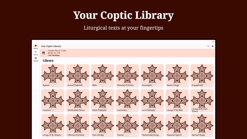 Multilingual access to Coptic Orthodox liturgical texts and readings. Supports many languages including Coptic, Arabic, English, French, German, Dutch, Spanish, Italian, Portuguese, Turkish, Chinese, Urdu, Indonesian, Thai, Chichewa, and Hindi.