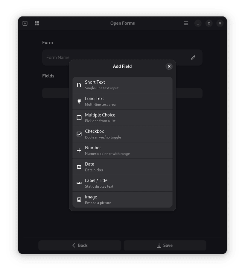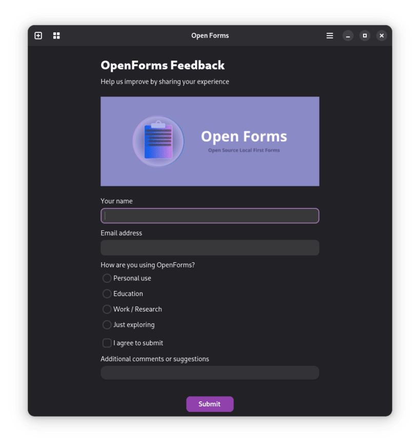 Open Forms is a simple, local-first form collection app for GNOME. It is designed for situations where setting up online forms is impractical or unreliable - such as conferences, meetups, workshops, or community events.