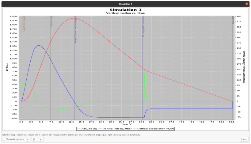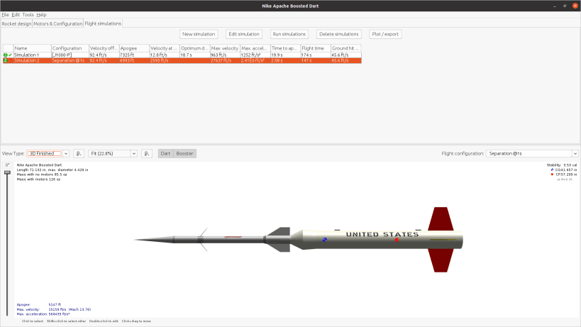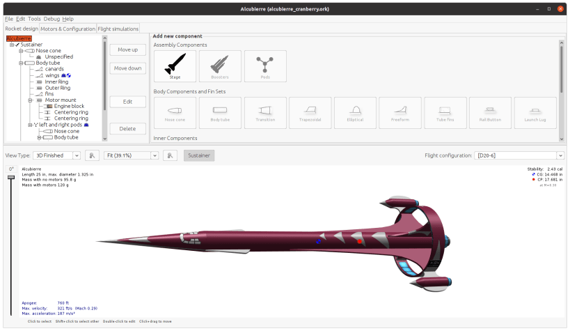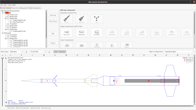 Performance data such as center of pressure, center of gravity, maximum altitude, max velocity and stability are all updated in real time as you work in design mode. See the effect of your changes the instant that you make them.