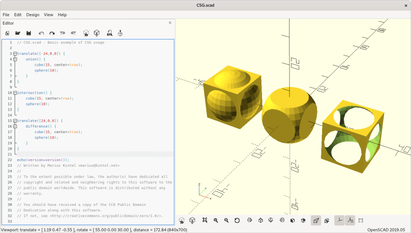 OpenSCAD is a software for creating solid 3D CAD objects. It focuses on CAD aspects rather than artistic ones. . OpenSCAD is not an interactive modeller. Instead it is something like a 3D-compiler that reads in a script file that describes the object and renders the 3D model from this script. This gives the designer full control over the modelling process and enables him to easily change any step in the modelling process or make designes that are defined by configurable parameters.