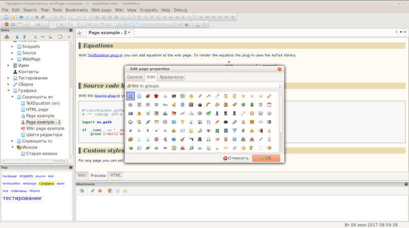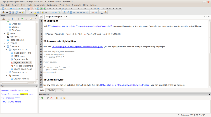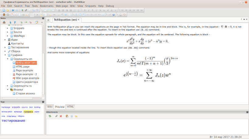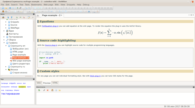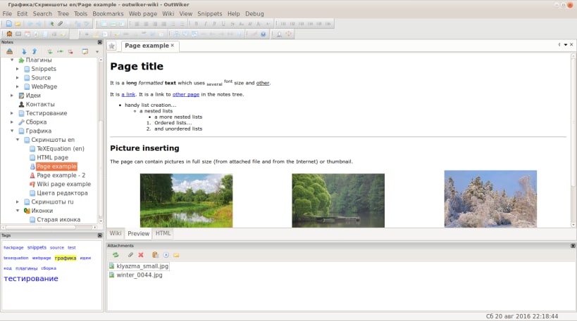 OutWiker is a cross-platform software for keeping your notes in a tree. Similar programs call "outliner", "tree-like editor" or personal wiki. Main difference OutWiker from other programs is a keeping notes as folders on disk. A notes can to have attached files. OutWiker can contain pages of different types, currently supports three types of pages: plain text, HTML pages and wiki pages.