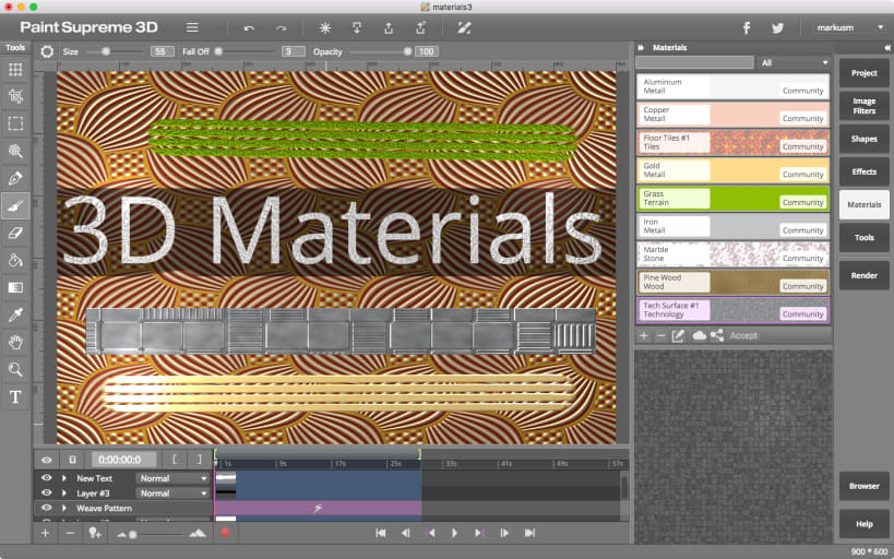 MATERIALS AND BUMPS • Optionally apply color, material and bumps when using your tools. • Choose if you want to add or remove depth (bumps). • Manually adjust your materials or use one of the inbuilt materials. • Create sophisticated new materials using the material editor and share them with the community.