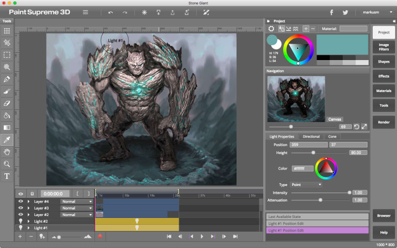 Take the attached screenshot of the "Stone Giant" for example. It has been painted with reflective materials, bumps and has been lit using two light sources. You can freely move the light sources to see how this changes the mood, lighting and shadows of the scene.