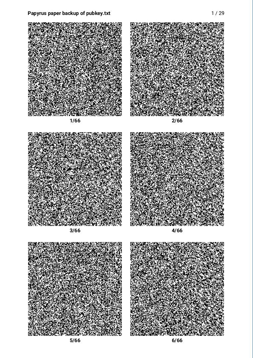 Papyrus can produce a PDF output which consist of QR codes made from your file to restore easily, in addition to OCR-friendly plain text version of your file, to prevent any failure on QR codes, with checksums for each line.