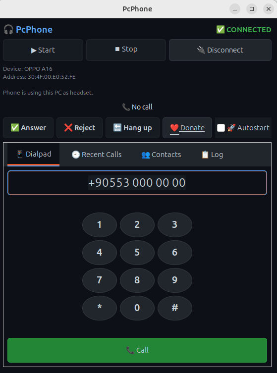 PcPhone allows you to use your Linux PC as a Bluetooth phone. Connect your Android phone via Bluetooth and make or receive calls directly from your computer using your PC's microphone and speakers.