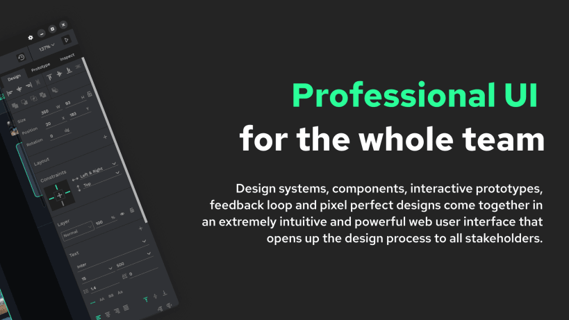 Professional UI for the whole team Design systems, components, interactive prototypes, feedback loop and pixel perfect designs come together in an extremely intuitive and powerful web user interface that opens up the design process to all stakeholders.