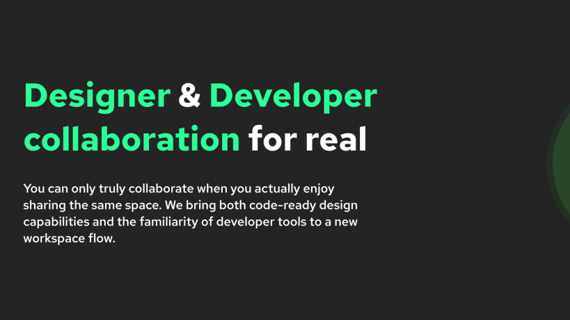 Designer & Developer collaboration for real You can only truly collaborate when you actually enjoy sharing the same space. We bring both code-ready design capabilities and the familiarity of developer tools to a new workspace flow.