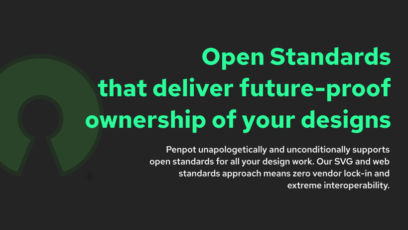 Penpot unapologetically and unconditionally supports open standards for all your design work. Our SVG and web standards approach means zero vendor lock-in and extreme interoperability.