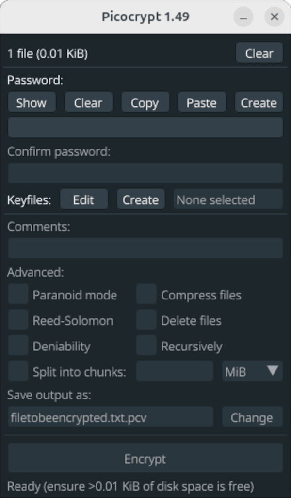 Picocrypt is a very small (hence Pico), very simple, yet very secure encryption tool that you can use to protect your files.
