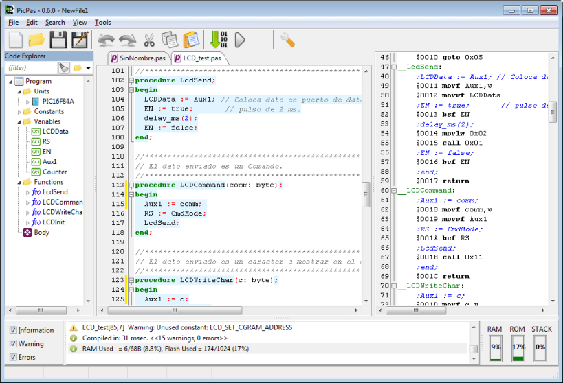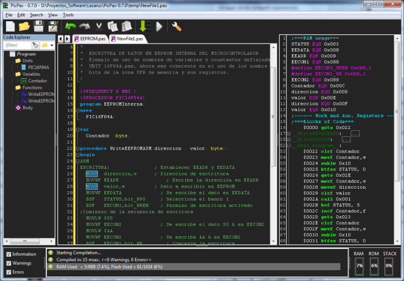 PicPas is a Pascal compiler and IDE, written in Lazarus, which generates executable code for Baseline and Mid-range PIC microcontrollers.