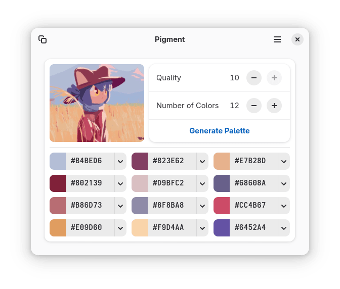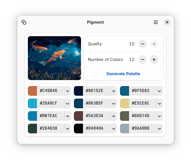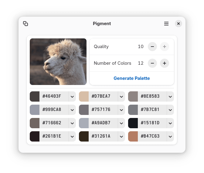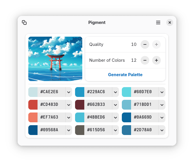 Pigment allows you to extract a palette of colors from your images offline. You can select the speed and accuracy by modifying the number and quality of colors.