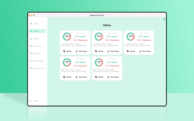 This plagiarism checker app automatically saves each plagiarism report in its History. You can easily access your previously checked files in this section and can download or delete them whenever you want.